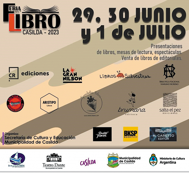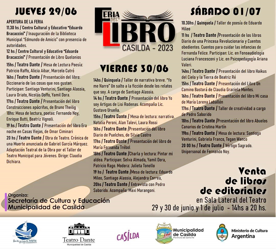 La Municipalidad de Casilda, a través de la Secretaría de Cultura y Educación, presenta la 2° Edición de la Feria del Libro 2023, que se desarrollará el 29 y 30 de junio y 1° de julio, en el Teatro Dante y el Complejo Cultural y Educativo Municipal “Benito Quinquela Martín”.