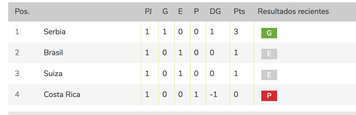 Por el Grupo E, Serbia ganó 1 a 0 a Costa Rica. Keylor Navas el arquero costaricense fue la figura. Por el mismo grupo, Brasil empató 1 a 1 con Suiza. Un desempeño bajo del equipo Verdeamarello. De esta manera sorpresivamente Serbia lidera el grupo con 3 puntos, le siguen Brasil y Suiza con 1 y cierra Costa Rica sin puntos.