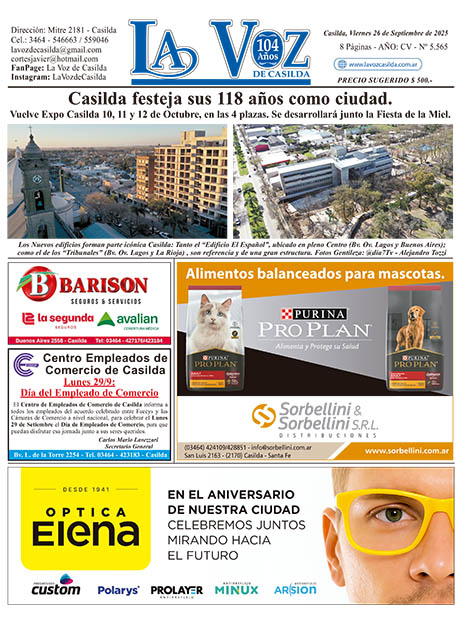 – 10, 11 y 12/10: Festejamos a lo Grande: Nuestras 4 plazas se llenan de actividades: Expo Casilda, show en vivo de grandes artistas, junto al Club Alumni y también la Fiesta Nacional del Oro Dulce y Provincial de la Miel junto a Club Aprendices, con la ele-cción de la Reina de la Miel y