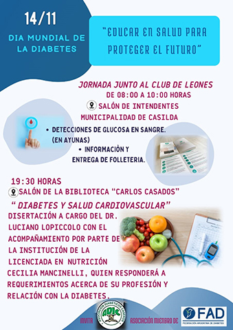 En Casilda, Adic: Asociación Diabéticos Caseros junto al Club de Leones en el Salón de los Intendentes del palacio municipal, están para realizar detecciones gratuitas de glucosa en sangre. Además, se entregan folletería en el ingreso. Para realizar las mediciones es necesario asistir en ayunas.