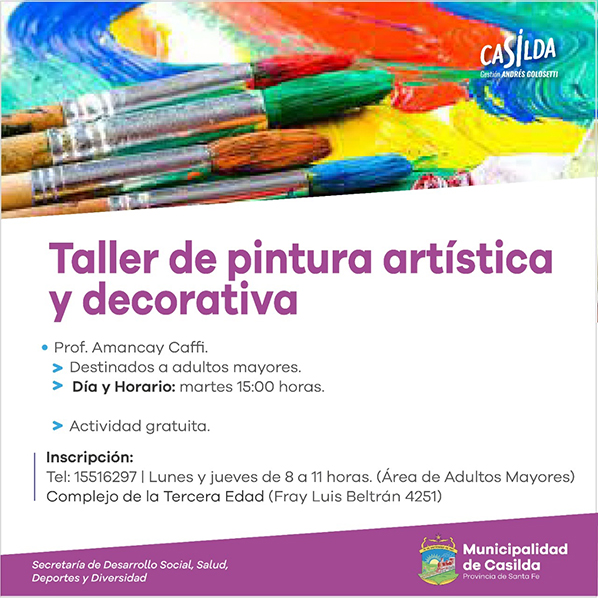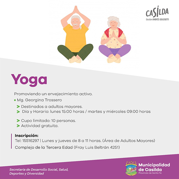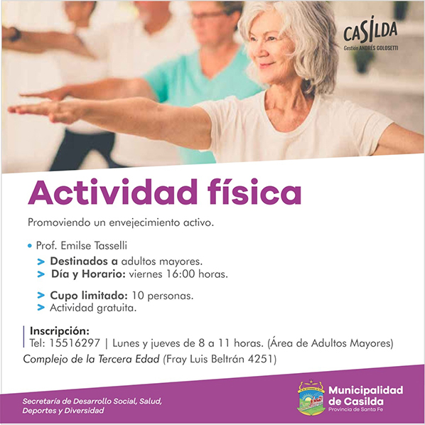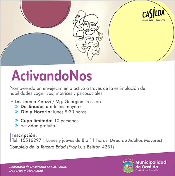 Adjuntamos las propuestas que se desarrollarán en el Complejo de la Tercera Edad (con nuevos horarios). Para participar de ellas, deberán inscribirse al teléfono del Área del Adulto Mayor 03464- 15516297, los días lunes y jueves de 8:00 a 11 hs. Se recuerda que todos estos espacios son totalmente gratuitos. A modo de presentación, nombramos los siguientes: